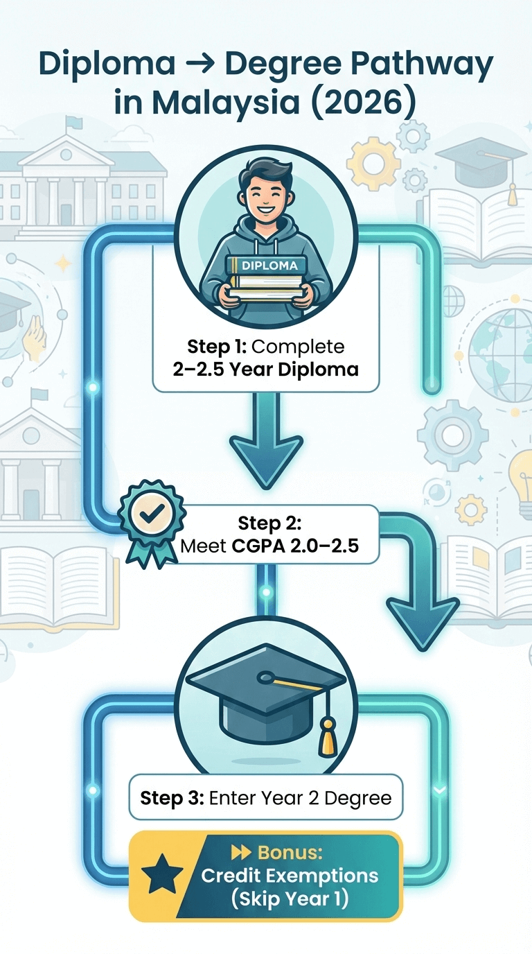 Malaysia offers a clear and structured diploma to degree pathway, allowing students to start with a diploma (lower cost, lower entry requirement) and then progress into a bachelor’s degree with credit transfer.