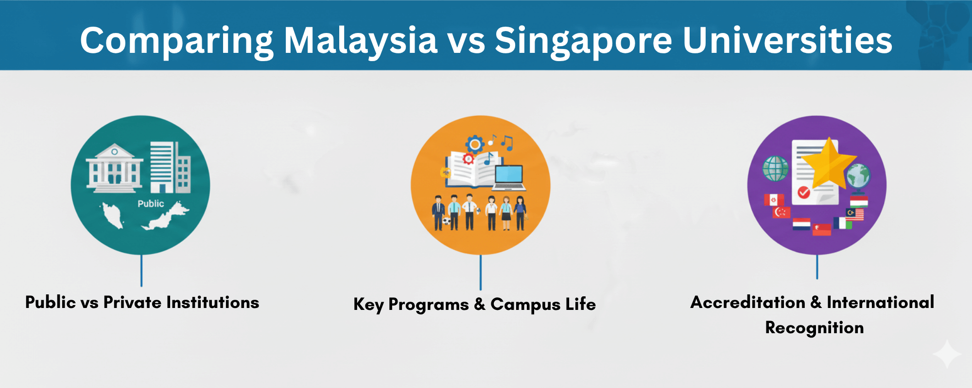➥ Accommodation & Facilities: Malaysian campuses provide affordable housing and good facilities; Singapore’s are modern but costlier.
